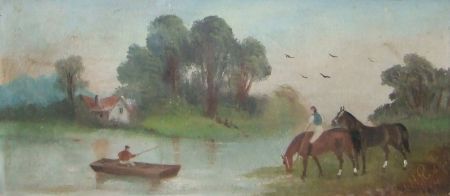 River Landscape with Figure in a Punt and Horses and Rider by Waters Edge