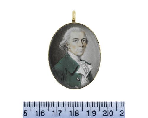 | A Gentleman, wearing green coat, white waistcoat, lace cravat and stock, his powdered wig worn en queue. Gold bracelet clasp mou | |