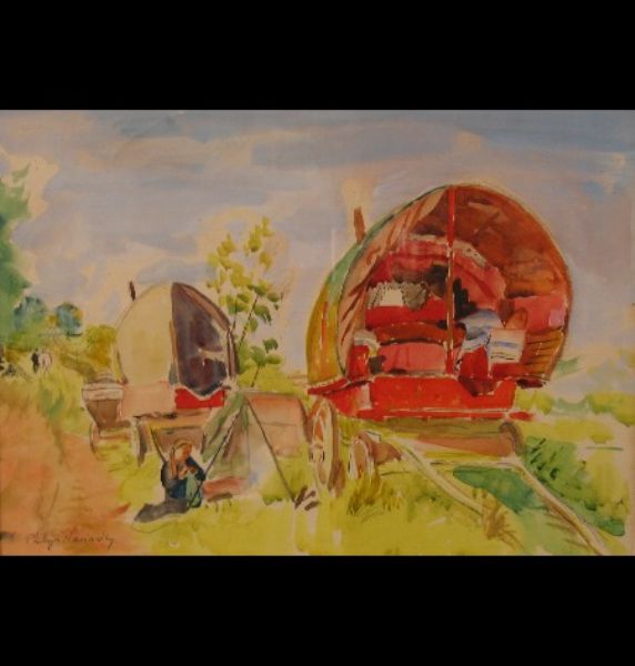 Gypsy encampment with figure sewing