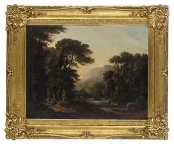 | A mountainous wooded river landscape, with figures resting on a path | |