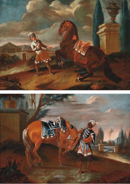 | A servant attending to an elegant horse in a park landscape; and A servant training a horse in a park landscape | |