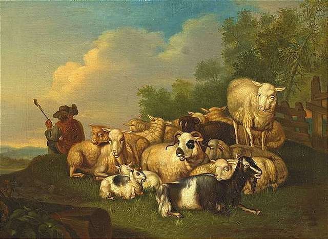 | Hirt mit Schafen und Ziegen in einer Landschaft | |