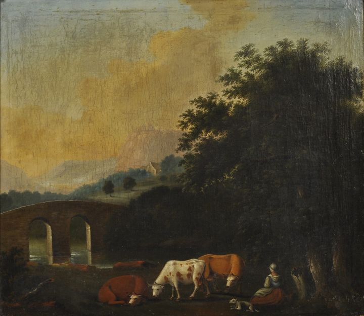 Nachfolge Landschaft mit Kuhhirtin, im Mittelgrund Fluss mit Steinbrücke