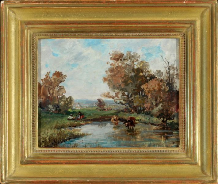 Voralpenlandschaft mit See, Kühen und Hirtenjunge