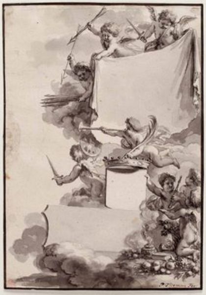 | Kämpfende und regierende Putten (Entwurf für ein Titelblatt mit leerem Adelswappen) | |