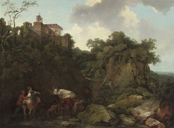 | A rocky wooded landscape with peasants and cattle on a track, a classical building beyond | |