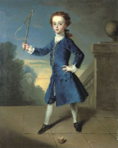 | Portrait of a boy, full-length, in a blue coat, with a spinning top on a terrace | |