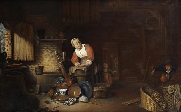 | The interior of a cottage, with a peasant woman cleaning kitchen utensils, a peasant coming up from the cellar on her left | |