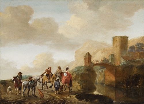 LANDSCAPE WITH TRAVELLERS AND BRIDGE