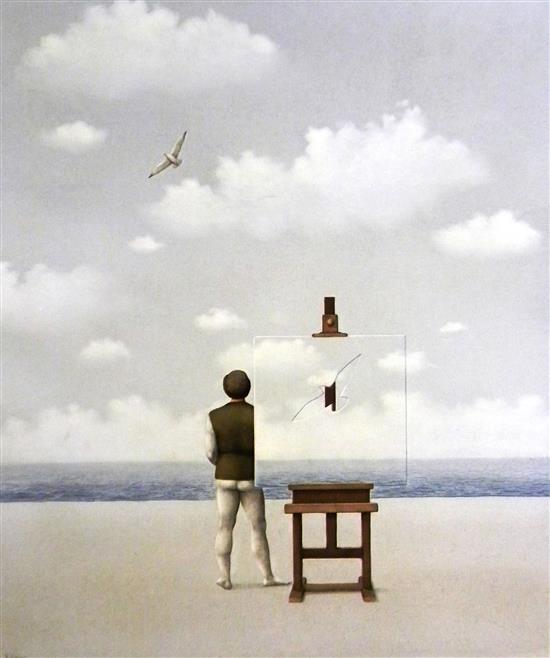 | surreal painting of man on beach watching as a seagull flies away from the painting leaving only an outline | |