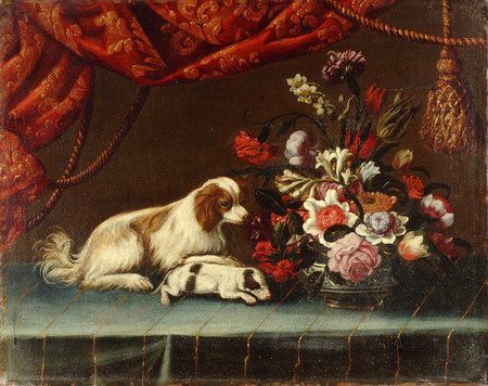NATURE MORTE AU VASE DE FLEURS ET CHIEN&