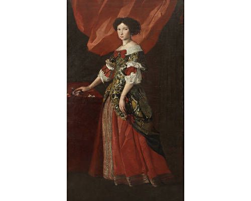 | Portrait of a lady, full-length, in a red and gold brocade dress standing before a red curtain | |