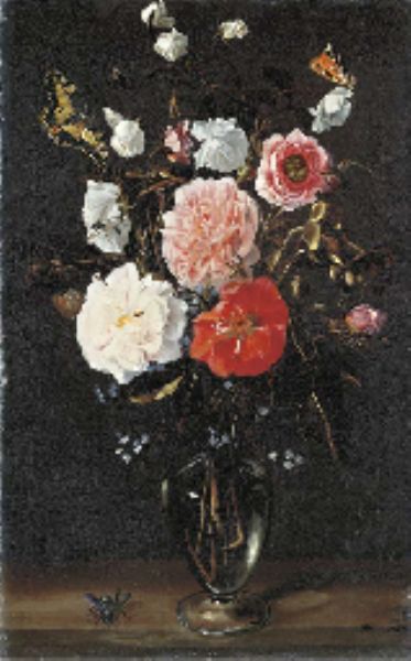 | Roses and forget-me-nots in a glass vase with butterflies and a beetle on a wooden ledge | |