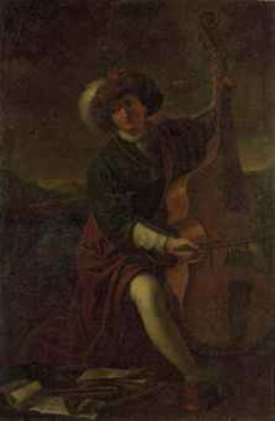 | A musician, full-length, in a green coat, a red cloak, white stockings and a plumed hat, playing a viola da gamba, in an extensi | |