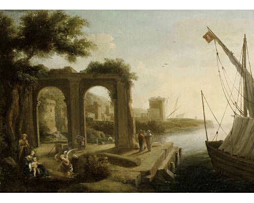 A Mediterranean port with figures before a ruined arch