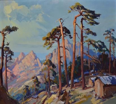 Pins et montagnes au bord de mer