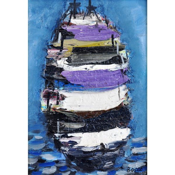 Abstrakt komposition i lila, vitt och svart mot blå fond