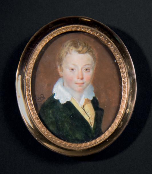 | Portrait de jeune garçon en buste vers la droite presque de face, vêtu d'un habit vert, gilet jaune et grand col de voile blanc; | |
