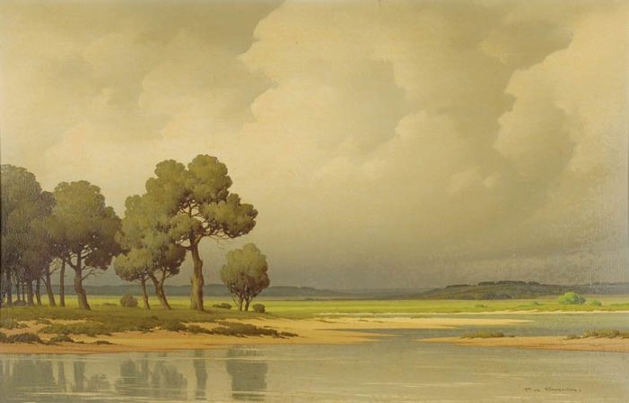 LANDSCAPE WITH RIVER AND STORMY SKY