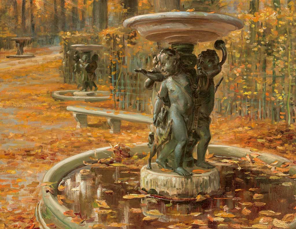 | Der eng gefasste Bildausschnitt zeigt eine Flucht von drei Wasserbassins mit skulpturalen Mittelstücken unter einem Schalenbecke | |