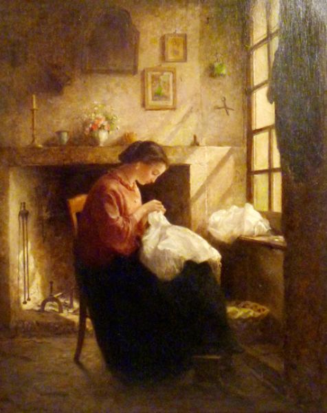 A WOMAN IN AN INTERIOR SEATED SEWING BEFORE A WINDOW