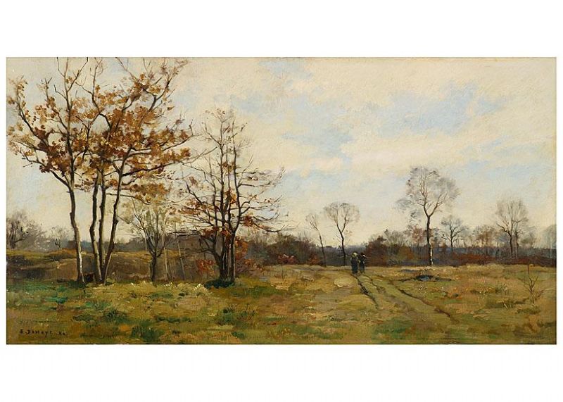Herbstliche Waldlandschaft bei Compiégne. Auf dem Wiesenweg Bauernpaar