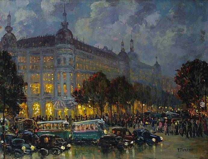 PARIS, LE PRINTEMPS ET LE BD HAUSSMANN À LA NUIT TOMBÉE