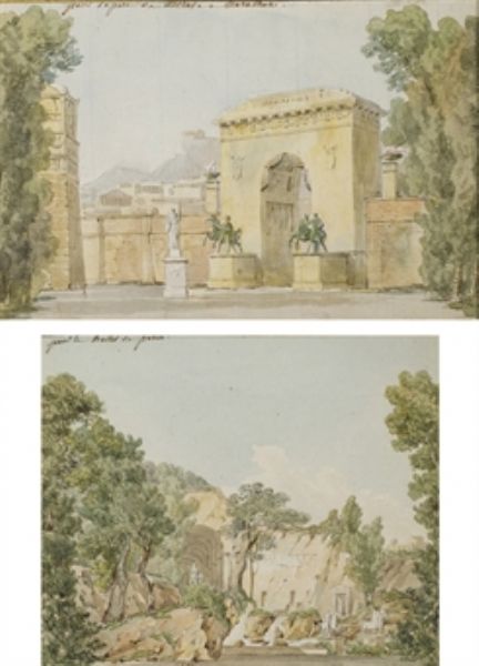 | Trois projets de décoration de théâtre: Un paysage rocheux; et Un arc de triomphe à l'entrée d'une ville; et Des ruines antiques | |
