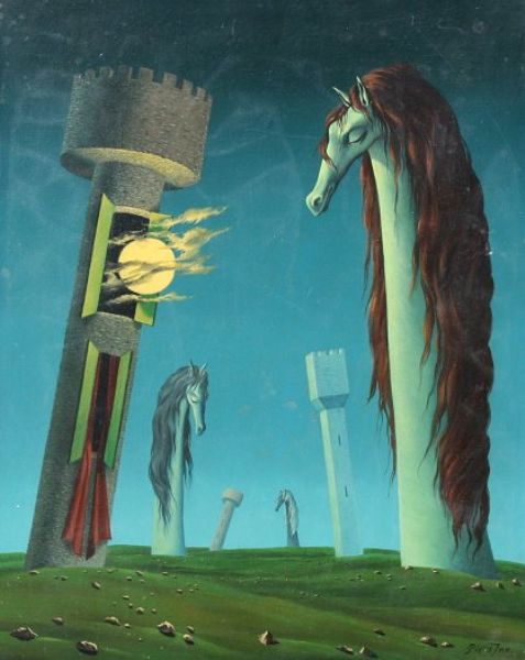 | Surreal Nocturnal Scene with Horses and Castles Emerging From the Earth | |