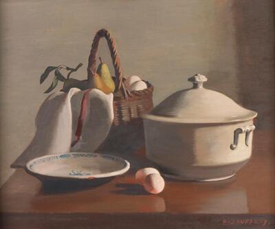 | Deux natures mortes l'une au panier de poires et à la soupière, l'autre au pichet et aux œufs. | |