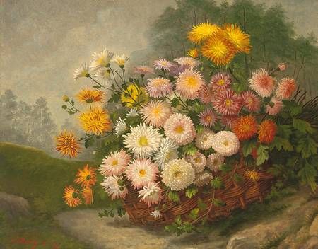 Stilleben mit Astern in Weidenkorb vor Landschaftshintergrund