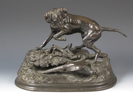 A pointer beside a pheasant on a naturalistic oval base