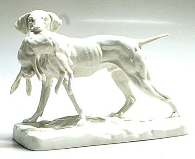Jagdhund mit erlegtem Hasen, Porzellan, weiß