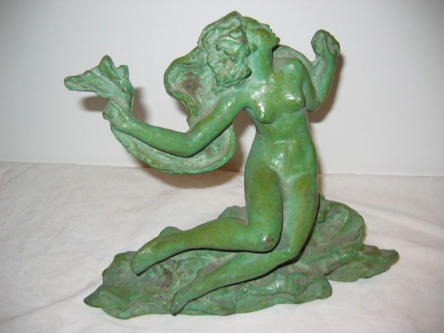 Cast bronze figure on a nude female seated on a rock with scarf behind her neck