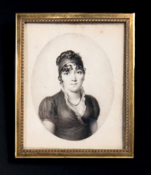 | Portrait d'une jeune femme en buste, robe à taille haute bordée de dentelle, la coiffure en boucles retombantes attachée par un | |