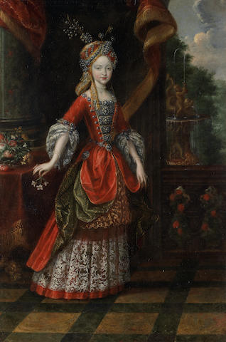 Portrait of a lady, full-length, in an embroidered dress before a landscape