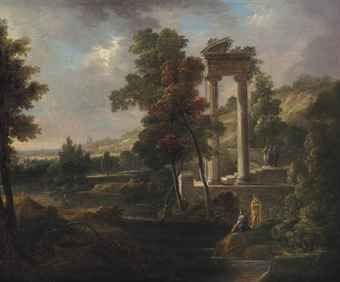| A river landscape with soldiers and classical figures amongst classical ruins | |