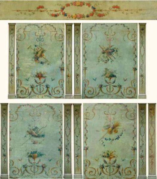 | Ensemble de seize panneaux décoratifs à motifs de guirlandes de fleurs, de fruits et d'instruments aratoires comprenant : | |