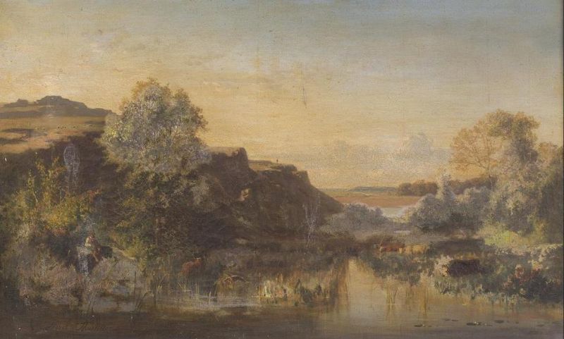 A RIVER LANDSCAPE WITH FIGURES AND CATTLE WATERING