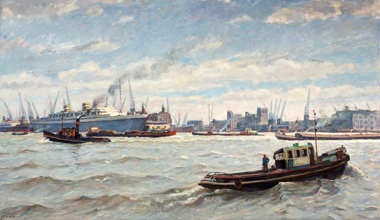 Nieuwe Maas met het hoofdkantoor van de Holland-Amerika Lijn en sleepboot de Rotterdam