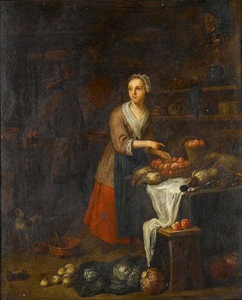 | A kitchen interior with a young woman standing at a table laden with fruit and dead birds | |
