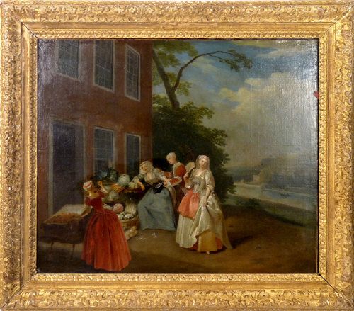 A FASHIONABLE COUPLE AT A FRUIT SELLER'S IN A RIVER LANDSCAPE
