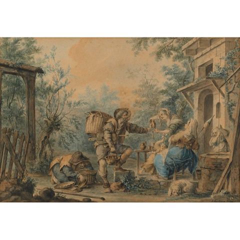 | A TINKER SELLING POTS AND PANS TO A PEASANT WOMAN OUTSIDE A COTTAGE | |