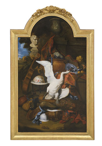 Natura morta con strumenti musicali, busto virile, globo celeste e animali su tappeto