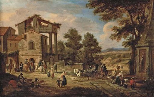 | The outskirts of a town with a washerwoman, travellers and resting labourers, a landscape beyond | |