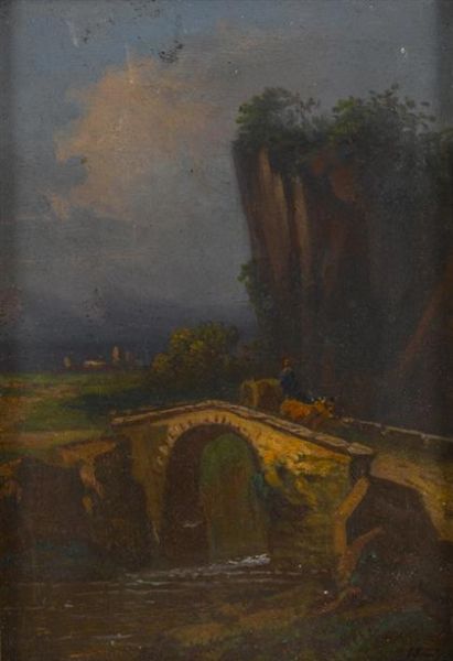 MOUNTAINOUS LANDSCAPE AND DROVER WITH CATTLE CROSSING A BRIDGE