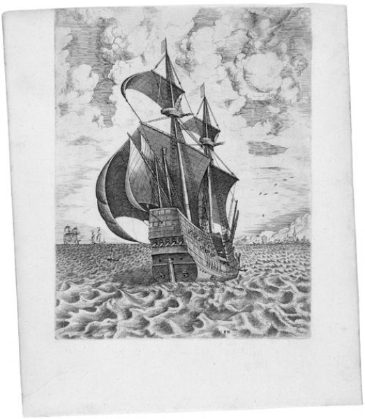 Bewaffneter Viermaster, auf einen Hafen zusegelnd