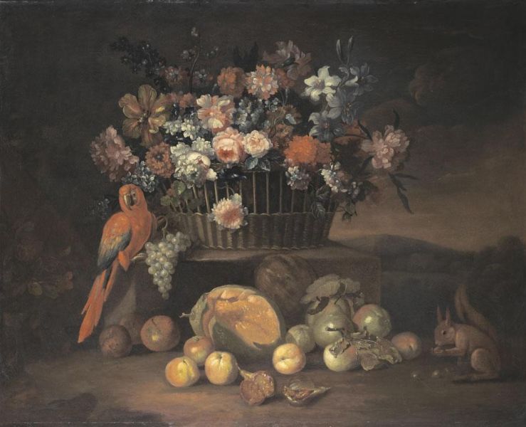 | A STILL LIFE OF A BASKET OF FLOWERS ON A LEDGE, WITH FRUIT, A PARROT AND A SQUIRREL, IN A LANDSCAPE SETTING | |