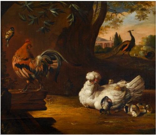 | A COCKEREL, HEN, CHICKS, PEACOCK AND OTHER BIRDS, IN AN ORNAMENTAL LANDSCAPE | |