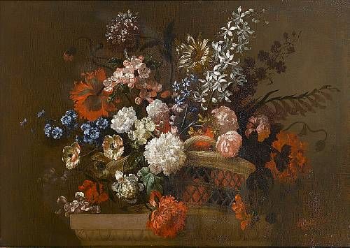 | Chrysanthemums, anemones, roses, poppies, primroses and other flowers in a basket on a carved stone ledge | |